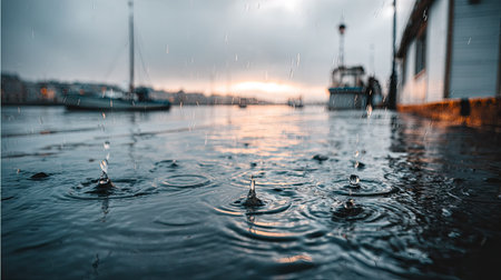 A close-up view of raindrops falling into a puddle, creating ripples. The soft focus background adds depth, while warm tones reflect the beauty of nature on a rainy day.