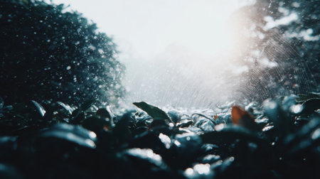 A moody, low-angle shot of dense, dark foliage with rain particles illuminated by a bright, hazy sun in the background. A mysterious and atmospheric natural scene.