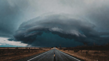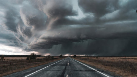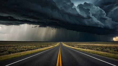 Majestic thunderstorm approaching on deserted highway with dramatic sky.