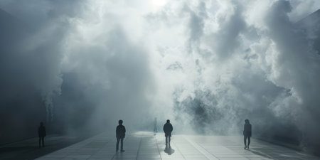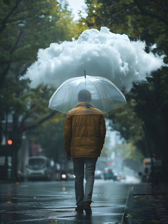 a person standing alone in a foggy field, with a dark storm cloud instead of a head, gentle rain falling,