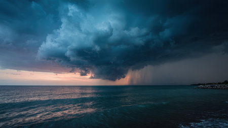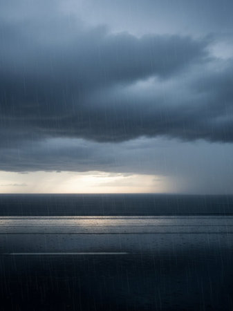 An image captures a coastal scene dominated by a vast, imposing display of dark storm clouds. Heavy rainfall descends towards the ocean surface, creating a stark contrast against the calm water. The composition highlights the raw power of nature, suitable for commercial or editorial applications.