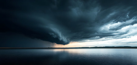 A powerful storm looms over a dark ocean, showcasing ominous clouds and heavy rain creating a dramatic and moody scene. Perfect for weather reports and disaster concepts.