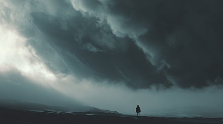 Man standing in the middle of a stormy landscape with dramatic clouds