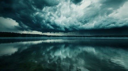 Dark storm clouds loom over a calm lake, creating an atmosphere of tension and anticipation. The surface captures ominous reflections, hinting at impending rain or a storm.