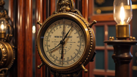 Antique brass barometer on wooden background with warm lighting. That the image is generated using AI.