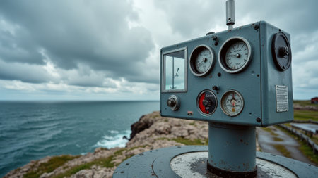 Vintage weather station on cliff overlooking rough sea and dramatic cloudy sky.