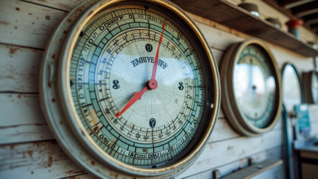 Vintage nautical barometer display on wooden panel in maritime setting.