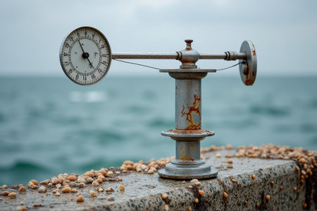 Rusty vintage barometer on seaside stone wall with shells by the ocean on a cloudy day.