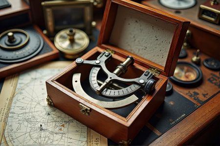 A detailed macro photograph of a vintage brass sextant, focusing on its intricate gears, lenses, and measurement scale. The image evokes themes of maritime history, celestial navigation, exploration, and precision engineering.