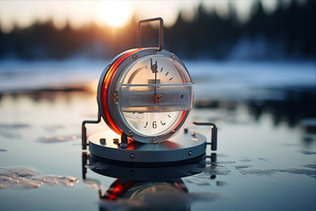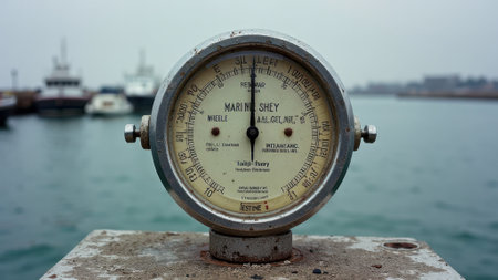 Vintage marine pressure gauge by water with boats in background on overcast day. That the image is generated using AI.