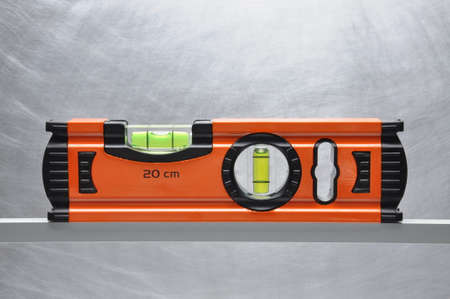 Small spirit level sits on a concrete surface, its green indicator bubble perfectly centered, signifying a level condition, ready for construction or diy projects