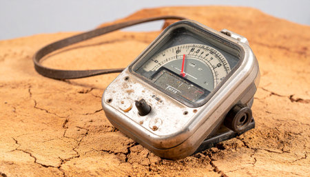 An old, forgotten pressure gauge rests on the parched, cracked surface of a dry landscape. A relic of a past era, its needle is frozen in time, silently measuring the emptiness of a world affected by drought and change. This image symbolizes forgotten technology, environmental pressure, and the enduring remnants of industry in a harsh, arid environment.