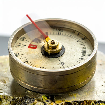 A close-up of a vintage industrial gauge, its red needle poised to measure pressure, voltage, or direction. This retro scientific instrument evokes a sense of history, precision engineering, and the dawn of technological measurement.
