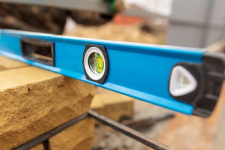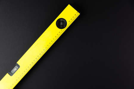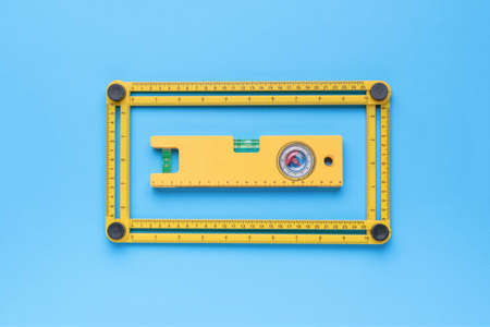 Yellow level and creative ruler on a blue background. Minimal concept of measuring instruments. flat lay.