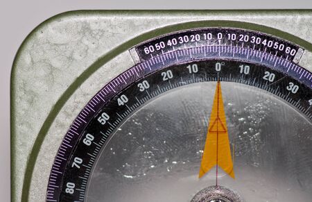 Macro shot of compass. Aircraft equipment, various indicators, buttons, instruments. The flight desk and control panel during take off and landing. Aircraft dashboard panel in pilot school