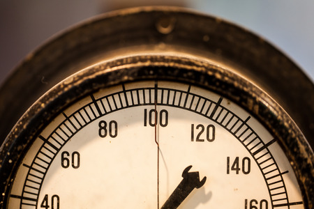 A close up view of an old, vintage gauge with gold accents is mounted on a machine. The gauge is circular with a white face and a black hand. The numbers and markings are faded and worn, but still readable. There are a few other gauges in the background, but they are out of focus.