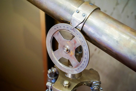 A closeup shot of a round controlling mechanism of a ship with a blurred background