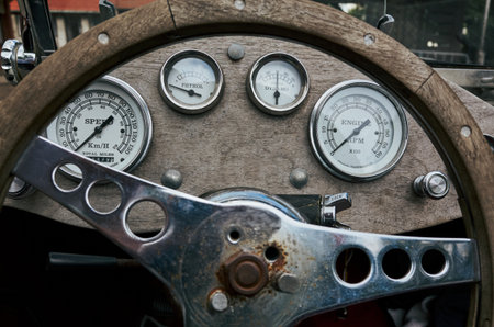The steering wheel of a vintage car has a few gauges on it. The gauges are for speedometer, tachometer, and oil pressure. The gauges are old and worn, giving the steering wheel a vintage look