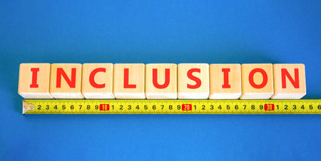 Inclusion symbol. Concept words Inclusion on beautiful wooden blocks. Beautiful blue background. Beautiful yellow ruler. Business support inclusion concept. Copy space.