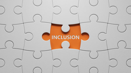 Symbol for a better inclusion. The white puzzle pieces with missing pieces with word 'inclusion'. Beautiful orange background. Copy space.3D rendering on orange background.