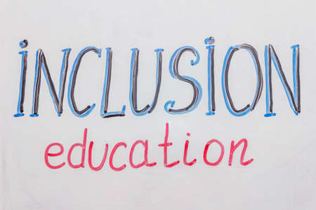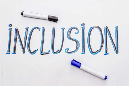 Hand drawn word inclusion education on marker board. Blue and black color, white background