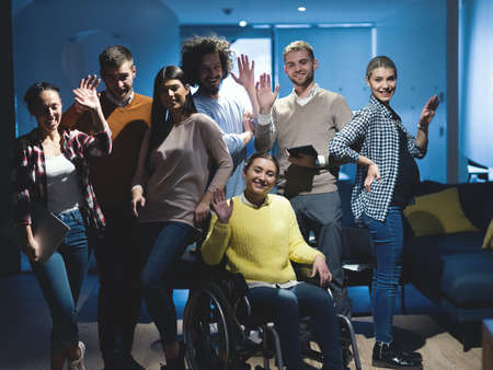 Disabled businesswoman in a wheelchair at the office with coworkers team