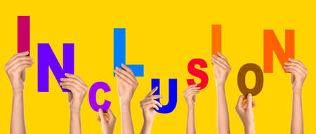 Inclusivity diversity words on wooden block on the yellow. Social concept