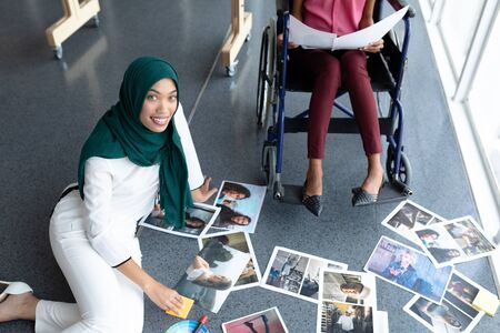 Portrait close up of mixed race female graphic designer looking at photographs in office. This is a casual creative start-up business office for a diverse team