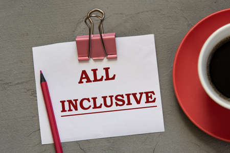 ALL INCLUSIVE - word on white paper on a gray background with a cup of coffee and a pencil. Info concept
