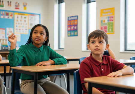 Side view of a diverse group of school children sitting at desks and raising their hands to answer a question during a lesson in an elementary school classroom
