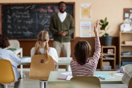 Selective focus shot of unrecognizable boy sitting at desk in classroom raising hand in English class, copy space