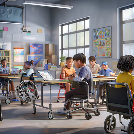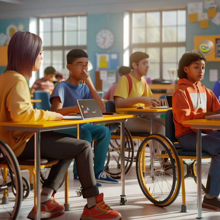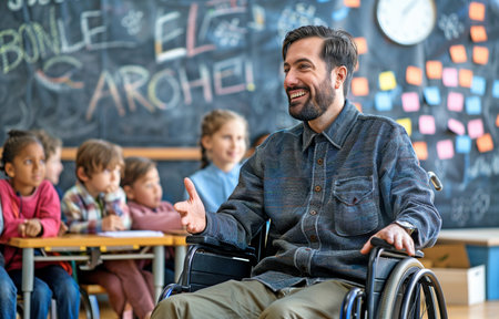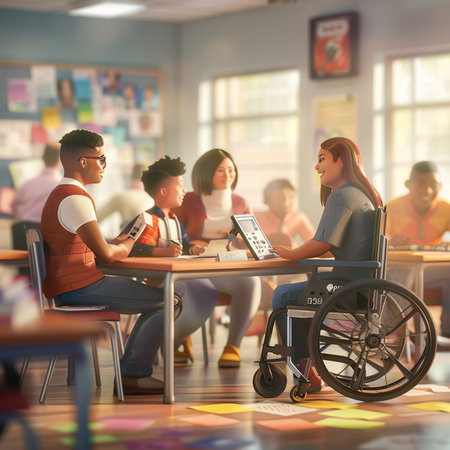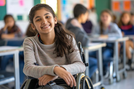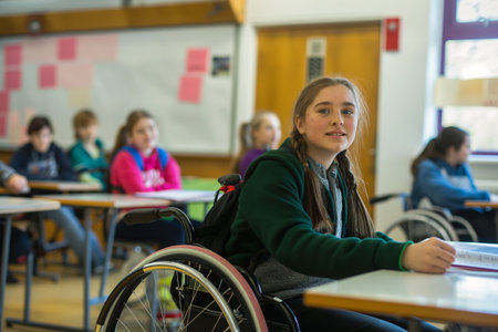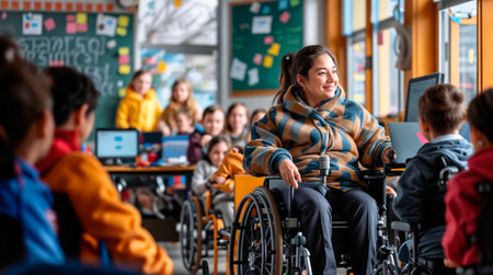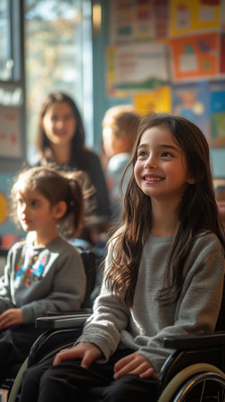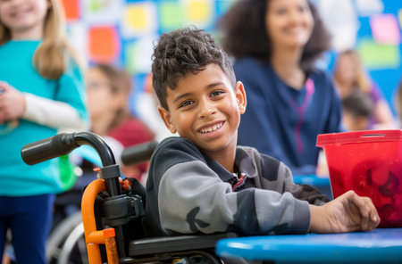 Happy diverse schoolgirl in wheelchair with her friend in school classroom. Education, inclusivity, elementary school, learning and disability concept.