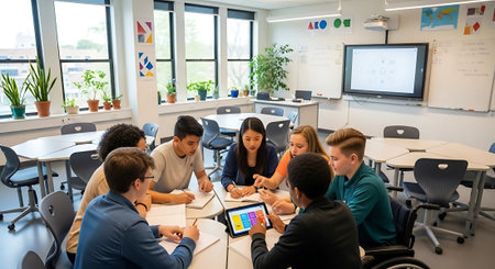 A diverse group of students gathers in a modern school classroom, passionately engaging in lively discussions about various projects, embracing teamwork and utilizing technology to enhance their learning experience