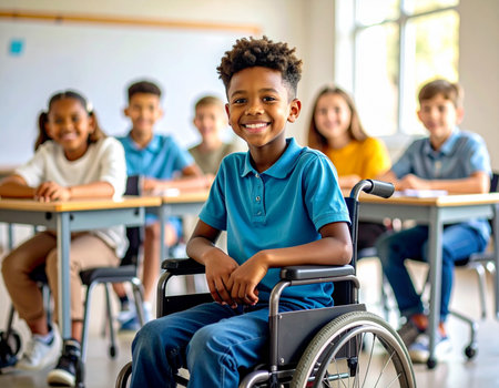 Portrait of disabled caucasian boy smiling while sitting on wheelchair in class at elementary school. school and education concept
