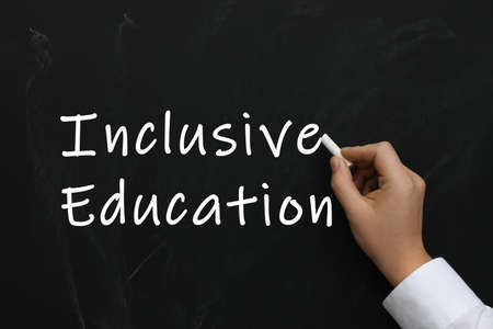 Woman writing phrase INCLUSIVE EDUCATION on blackboard, closeup