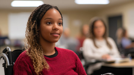 African teacher with disability sitting on wheelchair and reading lecture for medical students at university