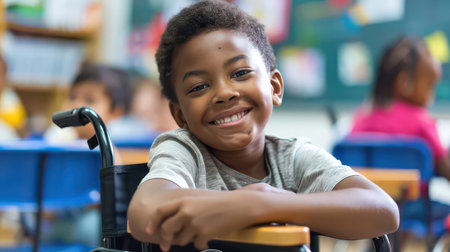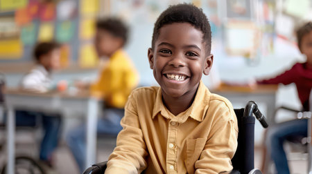 Portrait of smiling african american elementary girl sitting on wheelchair at desk in classroom. unaltered, education, childhood, disability, learning, physical disability and school concept.