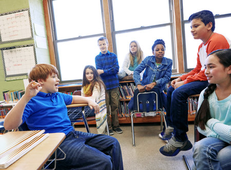 Classroom, child and talking to classmates, break and study tips for group, education or scholarship. Students, learning and listening to boy, conversation and knowledge for kids in elementary school