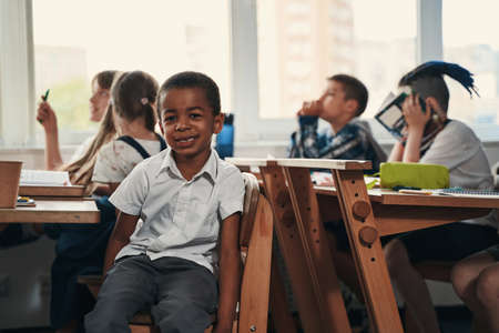 Portrait of smiling african american elementary schoolboy sitting on chair at desk in classroom. unaltered, education, childhood, learning, studying, book and school concept.