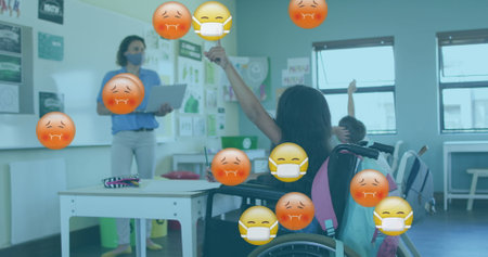 Multiple face mask and sick face emojis falling against female teacher teaching in class. covid-19 coronavirus pandemic concept