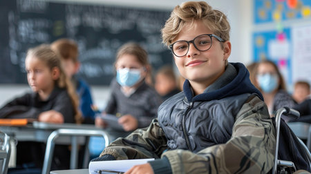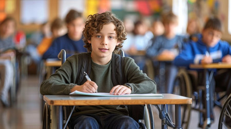 In school, boy in wheelchair writing in notebook, smiling in classroom. Education, learning, studying, childhood, inclusive, diversity