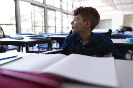 In school, young boy in wheelchair looking out window during class, copy space. Education, accessibility, learning, classroom, inclusion, diversity