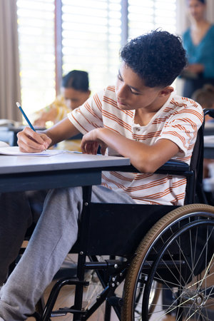 In school, boy in wheelchair writing in notebook, concentrating on task. Education, back to school, learning, studying, childhood, inclusion