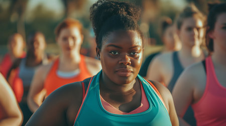 Group of diverse plus-size athletes in a bootcamp class, outdoors