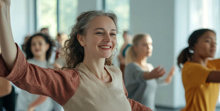 A diverse fitness class beams with positive energy, with a focus on a joyful woman in a yellow top at the forefront, embodying community and wellness