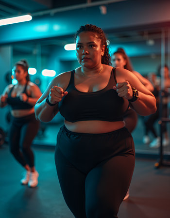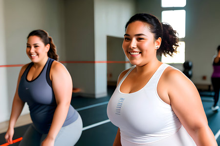 a powerful image of fat women lifting weights in a gym, their faces focused and determined, highlighting strength, empowerment, and the challenge of personal goals within a supportive community.