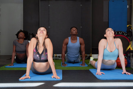 Group of multi ethnic people practicing yoga, promoting inclusivity and well being through mindful movement
