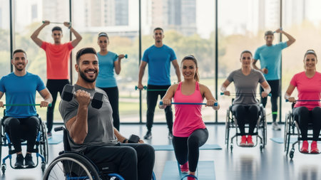 Inclusive fitness class with diverse individuals exercising in wheelchairs at a gym.