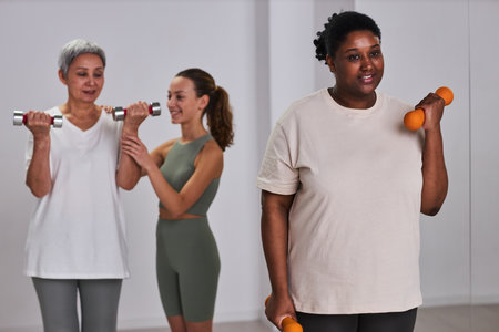 Overweight woman exercising with dumbbells in health club with instructor training mature woman in background