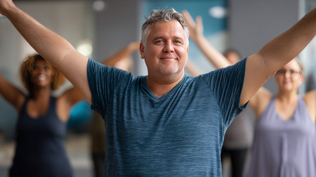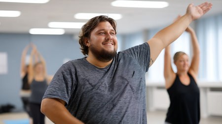 A man with obesity stretching in a yoga class, participating in fitness and well-being.